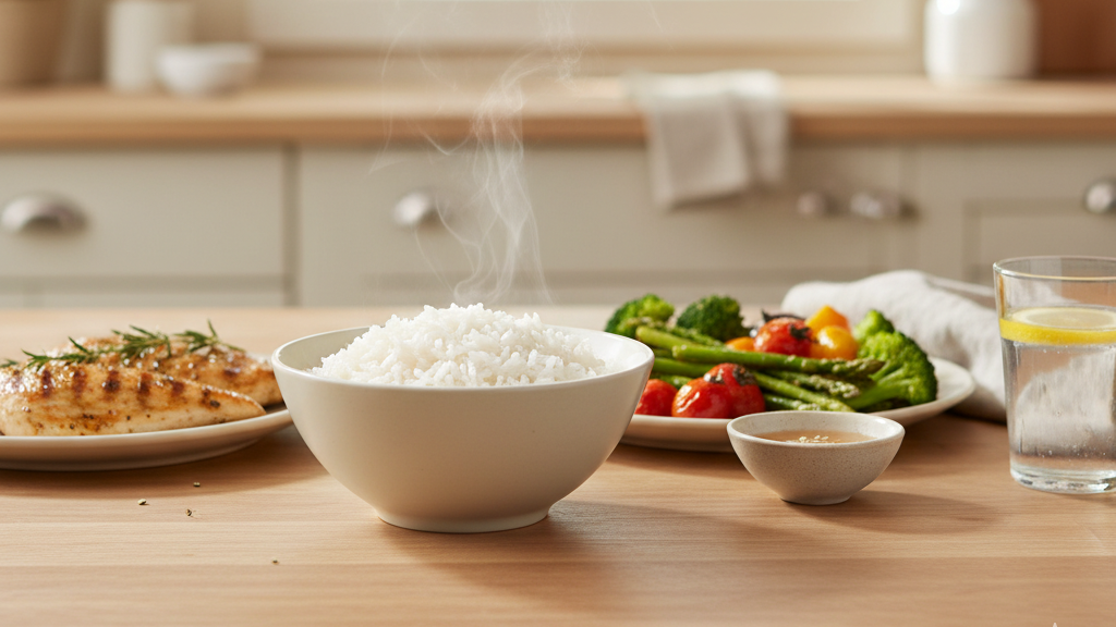 | Jazmín o basmati | 1 taza / 1.25 tazas de agua | 1.5 tazas crudo (200 g) | 4 tazas cocido (2–3 porciones) |
